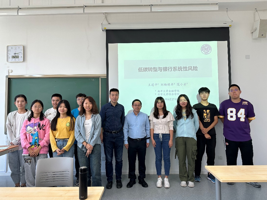 2023年9月27日下午,南开大学金融学院王道平副教授应邀在大数据与管理科学系列讲座上做了《低碳转型与银行系统性风险》主题报告。本次讲座在沙河二教203教室举行,由管理科学系魏璐老师主持,beat365英国官方网站副院长荆中博老师和多位同学参加,共同探讨了低碳转型与金融系统性风险的关键问题。