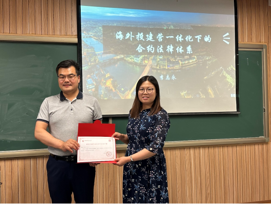 2024年6月22日晚上,中建国际建设有限公司总法律顾问兼首席合规官李志永先生应邀在我校学院南路校区主教207作《国际工程合约与法律体系》实践讲座,讲座由建设经济与管理系高然老师主持,MEM 2023级学员参加本次讲座。