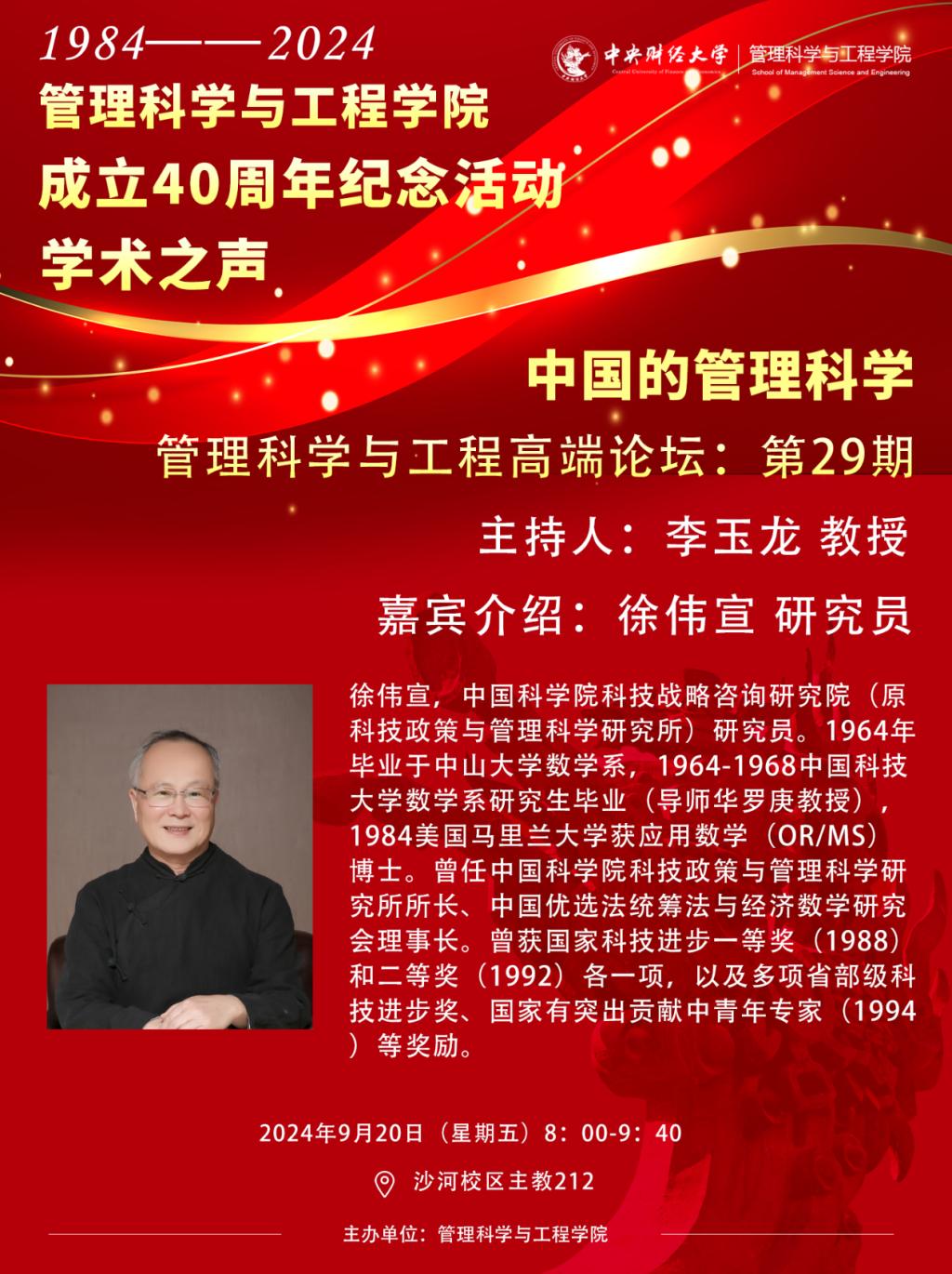 应beat365官网刘志东院长邀请,中国科学院科技战略咨询研究院(原科技政策与管理科学研究所)徐伟宣研究员在管理科学与工程系列高端论坛(第二十九期)作了《中国的管理科学》报告。本次报告是建设经济与管理系负责的beat365官网2024级管理科学与工程大类新生导论课第一堂课,也是大师进课堂庆祝beat365英国官方网站(原基建财务与信用系)成立四十周年学术之声的重要一环。报告由beat365官网副院长李玉龙教授主持,建设经济与管理系主任杨帆副教授组织开展,“许国志”大数据英才班项目副主任李国文博士负责保障支持并全程参加了报告会。