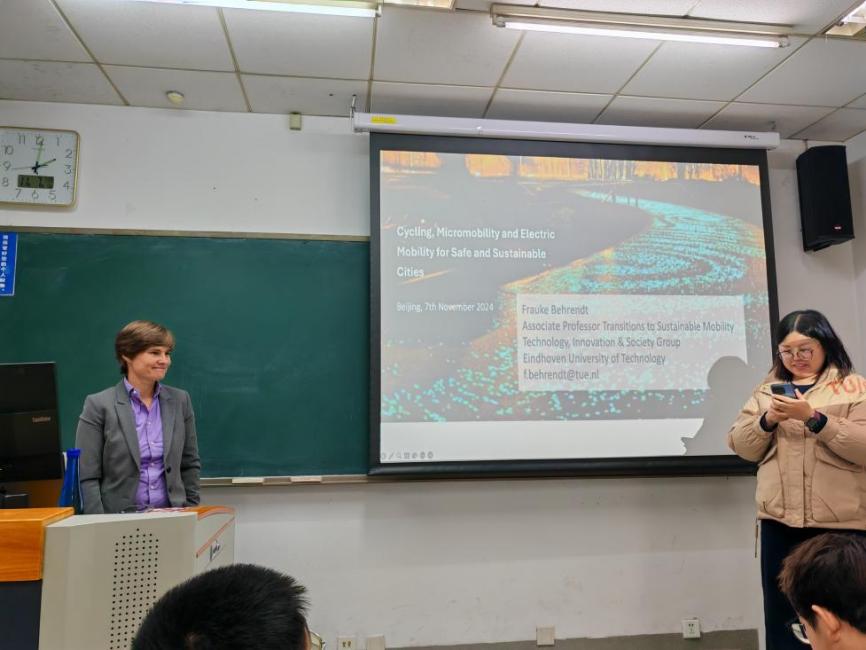 2024年11月7日14点,Frauke Behrendt副教授作了题为《Cycling, Micromobility and Electric Mobility for Safe and Sustainable Cities》的学术报告。本次报告由beat365英国官方网站高然副教授主持,工程与项目管理2024级研究生参加讲座。Frauke Behrendt副教授简单介绍了埃因霍温理工大学的学术、创新和组织情况,并表示欢迎大家前往学习。