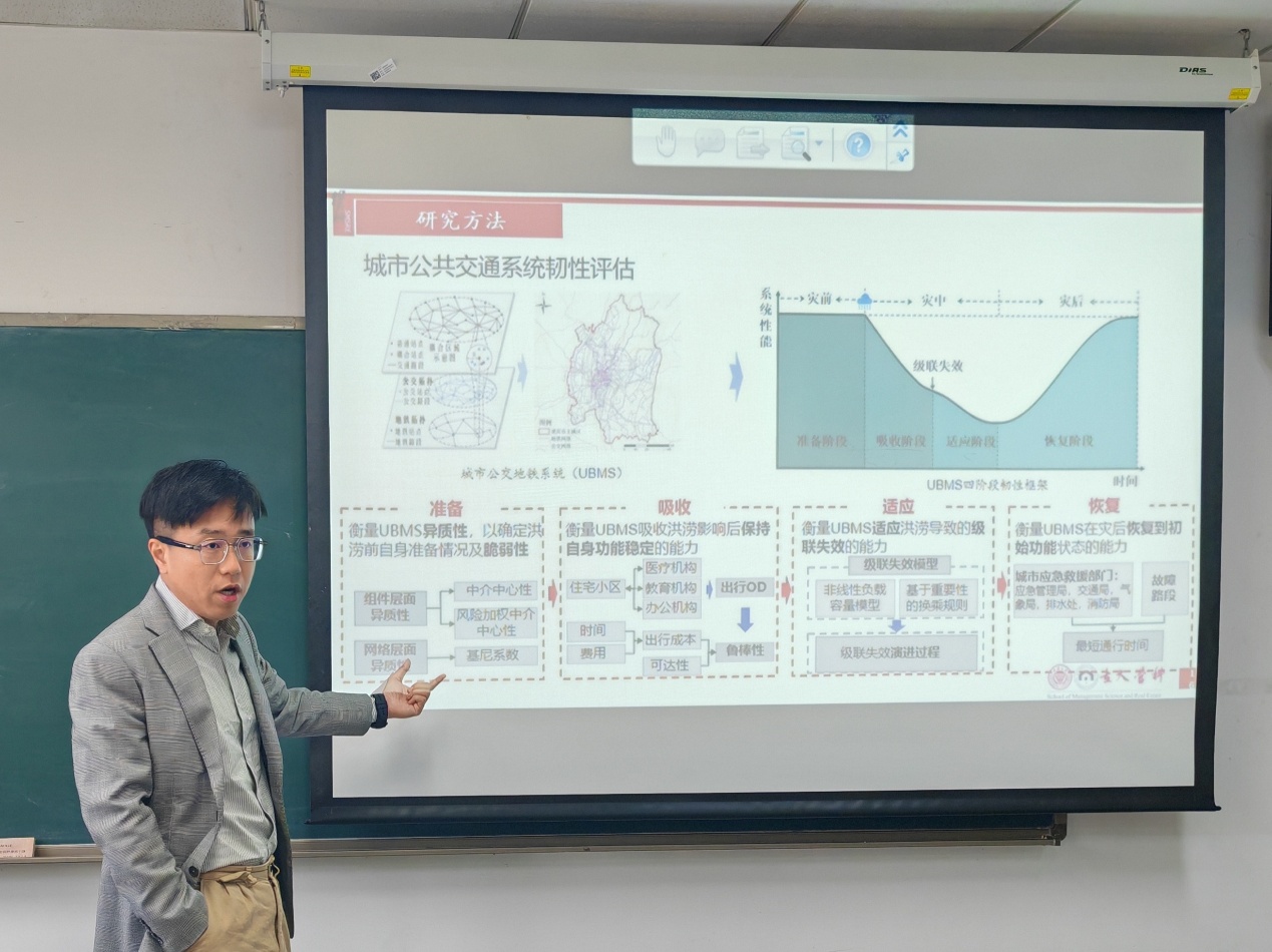 讲座伊始,洪竞科教授介绍了研究背景,近年来,随着气候变化的加剧,特大暴雨、高温、干旱和寒潮等极端天气事件的频率和强度显著增加,而我国自然灾害频次位居世界之首的同时经济损失位居世界第二。并且在我国各类自然灾害中,洪涝灾害发生频率高、社会影响大,洪涝灾害能直接造成城市基础设施中断,并造成经济损失。