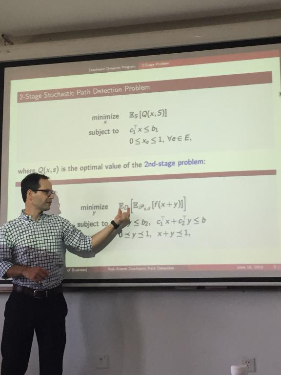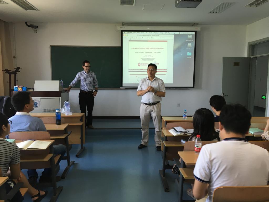 访问期间,Ricardo副教授于2016年6月16日上午9:00-10:00在beat365英国官方网站沙河校区西区主教学楼506教室面向老师和学生们做了题为《Risk-Averse Stochastic Network Interdiction》的公开讲座。
