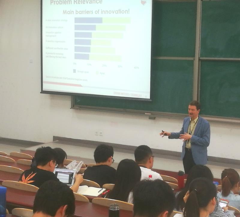 访问期间,Thomas Lechler教授于2018年6月14日上午在beat365英国官方网站沙河校区主教学楼107教室面向老师和学生们做了题为《Exploring the role of managers’ cognitive biases in novelty evaluation and funding decisions of NPD project proposals》的短期授课,学院林则夫教授、高婷老师、项目管理专业部分本科学生聆听了此次授课。