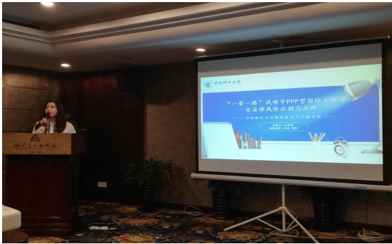 吴思佳同学在2019年5月11日下午会场二(研究生学术论坛)进行学术汇报,主题为《“一带一路”倡议中PPP模式下国际工程项目法律风险识别与应对》,演讲内容主要根据PPP型国际工程阶段性等特征,在考虑国际工程各阶段法律自身风险的基础上,进一步考虑阶段法律风险之间的关联程度,并针对各阶段重大法律风险提出针对性应对措施。此次演讲一共分成五个部分,包括引言、文献计量与综述、风险识别与分析、风险应对以及总结与展望。