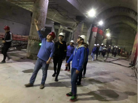 随后,师生一行前往站台处现场,现场负责人进行了现场教学指导,详细介绍了地铁站台施工的流程、注意事项和后续工作详情。同学们了解到整个路线分为两个区间,车站长276m,共有4个竖井,其中2号、4号是临时竖井,仅为施工方便而挖,待工程结束后将被填上。在站台现场,教师和学生们都表现出了极大的兴趣,积极向负责人询问具体的施工技术流程、已有的结构作用和施工时要考虑的重要事项。负责人一一向大家解答了这些疑问,使师生一行对地铁的建设有了更清晰的认识。