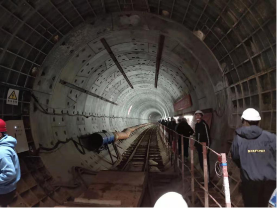 进入隧道施工现场后,现场的负责人为同学们详细介绍了隧道管片安装的步骤和方法。项目采用标准环和转弯环管片对设计隧道平纵曲线拟合,每环管片由六块管片组成:三块标准块、两块邻接块、一块封顶块,每块管片长1.5m,厚0.3m,内径为5.4m,总重1~2t,使用期限在100年以上。为了落实追责管理,每片管片上都有生产日期和编号,通过编号可以找到生产厂家和安装负责人。