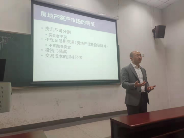 彭亮副教授首先介绍了房地产资产市场的特征,以一个日常生活中的例子向在场的老师同学们说明了房屋的异质性。彭亮副教授表示房地产作为资产,具有异质性、缺乏流动性、贵且不可分割、不在交易所交易(房地产信托投资除外)等特征,因此其与一般资产不同,具有特殊性。随后,彭亮副教授通过介绍其做的相关研究,说明了房地产风险与回报的关系并不像普遍理解中的高风险高回报,而可能恰恰相反。相关研究中,彭亮副教授先利用美国丹佛的重复交易数据,将地区按照邮政编码划分作为细分市场,计算了房地产价格指数。通过计算价格增值的年化收益率与其标准差,发现回报与风险是无关的或者负相关,例如越贵的房子风险越低,回报越高。后又对价格不确定性与收入之间的关系,通过Hedonic模型的回归余项以及家庭收入作图,反映了大体上收入越高,风险越低。在发现美国房地产市场的情况后,彭亮副教授也阐述分析了中国房价与系统性风险的关系。相比美国低密度住房为主的情况,中国存在着大量高楼,因此通过北上广深中同一楼盘不同户型的房价与系统性风险的研究,发现在中国市场大户型的房子风险更低。本次讲座激发了同学们对于房地产行业研究的兴趣,使参会同学获益匪浅。