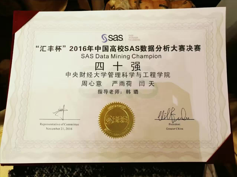 2016年11月21日,由全球数据分析领域的领导者SAS主办、由汇丰银行(HSBC)冠名赞助、深圳索信达数据技术股份有限公司承办的“汇丰杯”2016年中国高校SAS数据分析大赛在北京钓鱼台国宾馆圆满落幕。大赛初赛于2016年10月23日,在全国18个城市24个赛区同时开赛,一共658支队伍进行激烈的比拼,最终130支队伍脱颖而出,会师决赛。在管理科学系韩璐老师的指导下,由管科14的周心意、严雨荷和投资13的闫天组成的团队利用所学专业知识,经过初赛和决赛的激烈争夺,在本次大赛中收获了40强的好成绩。