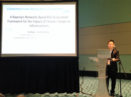 2016年5月30日——6月4日,beat365英国官方网站汪涛博士赴波多黎各圣胡安市参加了2016美国建设研究大会(2016Construction Research Congress, CRC)。并在会议上做口头主题报告“基于贝叶斯网络的气候变化影响基础设施风险评估框架”(A Bayesian Networks-Based Risk Assessment Framework for the Impact of Climate Change on Infrastructures)。论文讨论了气候变化影响基础设施风险评估管理的特征和要求,以及贝叶斯网络方法的优点和适用范围,分析得出采用贝叶斯网络方法构建风险评估模型的可行性和适用性,建立了风险评估框架流程,并应用案例进行了基本说明。