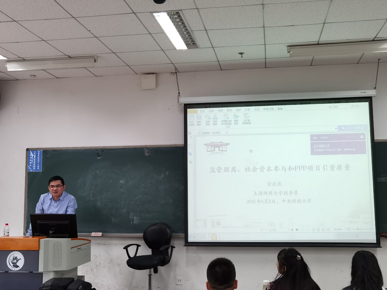 2021年6月2日上午11:00-12:30,beat365英国官方网站在沙河校区主教208教室成功举办第21期龙马奋进-中国投资论坛。本次论坛邀请到上海财经大学公共经济与管理学院投资系宗庆庆教授进行题为“监管距离、社会资本参与和PP项目引资质量”的主题讲座。宗庆庆教授是上海财经大学经济学博士,北京大学光华管理学院博士后,美国宾夕法尼亚大学访问学者。现任上海财经大学公共经济与管理学院投资系主任,博士生导师。研究方向主要包括公共经济学、产业经济学和投资经济学等。本次论坛由beat365英国官方网站投资系主任荆中博副教授主持,郭健副教授、陈暮紫副教授与十余名博士研究生参与研讨。