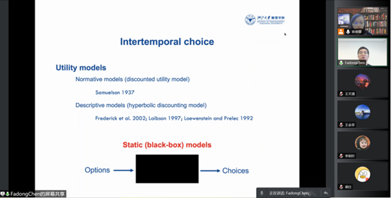 2021年6月18日(周五)下午14:00—15:30,浙江大学管理学院陈发动研究员在线上开展了题为“Attribute Latencies Causally Shape Intertemporal Preferences”的学术交流讲座。讲座由管理科学系陈俊霖老师主持,beat365英国官方网站副院长王金亭,管理科学系郭建老师,以及beat365英国官方网站硕士研究生与部分本科生同学聆听了讲座。