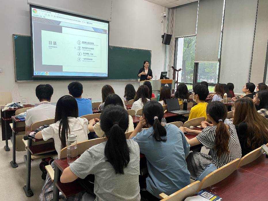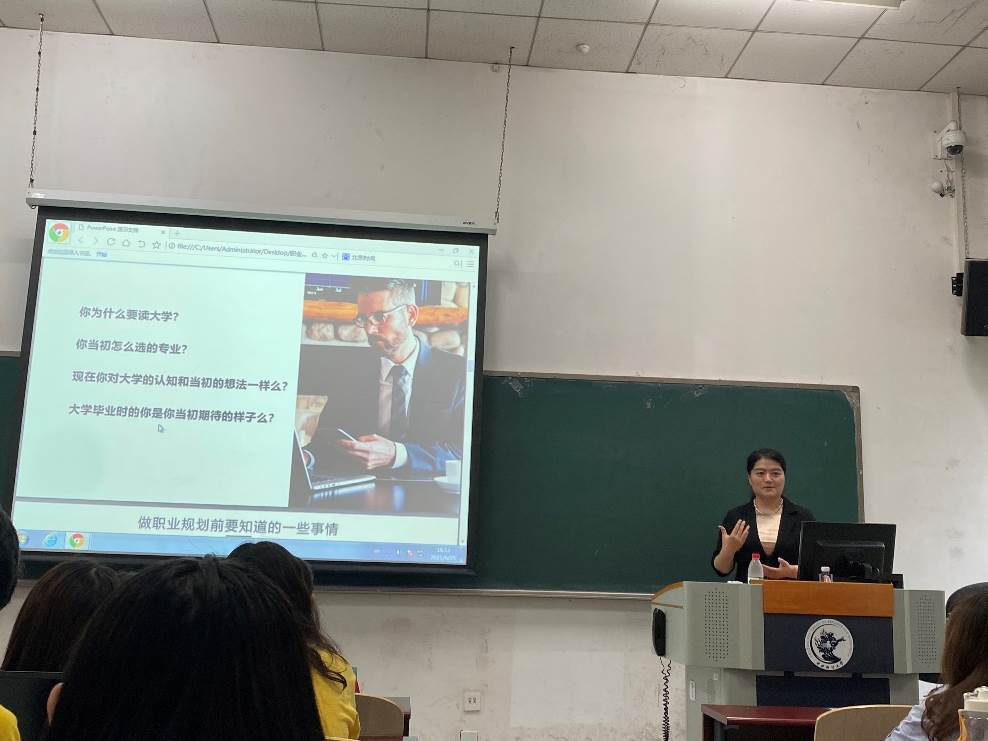 6月25日下午4:00-6:00,北京京合祥投资顾问有限公司总裁与浙江自贸区慧生济缘生命科学有限公司董事长丁锐女士在我校主教102教室就大学生未来的职业规划做出分享。与会人员为管科19的全体同学以及班主任陈俊霖老师,还有其他班的老师和同学。