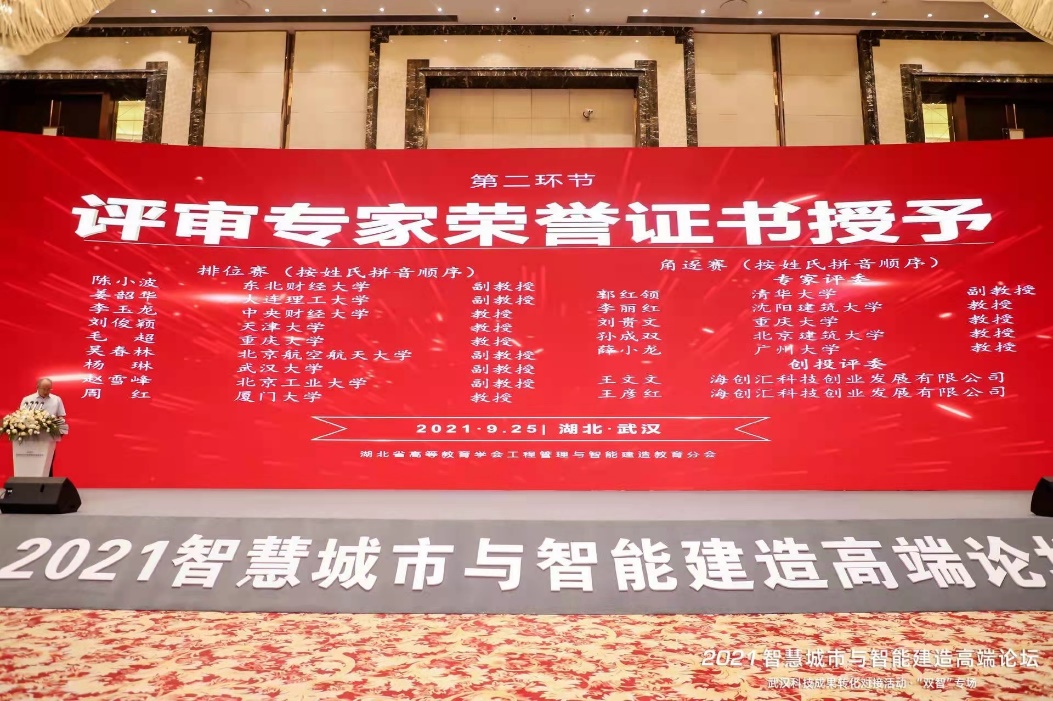 教育论坛结束后,工程管理系教师继续参加了由武汉市政府和华中科技大学联合主办的2021双智高端论坛。该论坛邀请了人工智能、智能建造、云计算等领域的院士、专家、学者做主旨演讲和高端对话,集中展示了智慧城市与智能建造领域最前沿的新理念、新技术、新产品和新应用。高端论坛最后进行了双智大学生创新创业竞赛的颁奖仪式,李玉龙教授作为大赛评审专家参加了荣誉证书授予仪式。