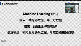 随后,彭桓针对“如何做大数据分析”结合实际项目进行了讲解并列举了人工智能在保险业其他的应用场景,如:智能核保、风险控制、精算定价、录单、数据整理、智能客服、知识图谱、自动文章、核保理赔、智能客服营销等。