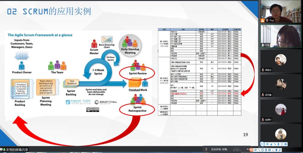 首先,宋雪介绍了敏捷(Agile)是在互联网兴起后应运而生,目前已经成为包括互联网与软件、智能制造与研发等各个行业产品开发与项目管理的首选方法。接着,她重点阐述了敏捷里面的Scrum框架,指出Scrum适用于需求变化频繁、内外部环境变化快、需要快速交付和验证的场景,也是应用最为广泛和最受欢迎的敏捷方法。Scrum有其独特的价值观,它的流程也与传统项目管理有很大不同。宋雪结合她参与的多个Scrum项目开发,展示了实际项目中的产品代办列表,计划纸牌、每日站会、看板、和燃尽图等,并为大家讲解具体的Scrum流程框架,包括构想、检测、探索、适应与结束等五个阶段。通过案例讲解,大家体会到了Scrum与传统项目管理的不同之处。宋雪继而为大家进一步梳理总结了这二者在至少十方面的不同表现。最后,她指出传统项目管理方法和敏捷项目管理方法各自都有优势和局限性,采用哪种方法需要根据项目情况来判断。接下来的互动环节,同学们展开了热烈的讨论,提出了各种各样的问题。有的是关于实践中如何确定不同的项目管理方法,有的关于敏捷在其他行业的应用,以及Scrum在实操中的一些问题,宋雪一一为大家做了满意的答复。论坛结束前,高婷副教授再次向主讲嘉宾与参会人员表示了感谢。