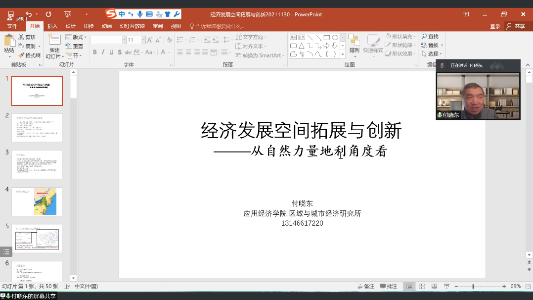 2021年12月2日下午14:00-16:00,beat365官网邀请到中国人民大学应用经济学院区域与城市经济研究所付晓东教授开展了“经济发展空间拓展与创新”的线上讲座。付晓东,中国人民大学应用经济学院区域与城市经济研究所教授、博士生导师,全国经济地理研究会副会长。曾在地方工作十余年,从事教学与科研20年。在国内外核心期刊发表论文70余篇,出版著作3部,承担国家(国家社科基金、教育部社科、科技部专项)、地方科研课题多项,获得多项荣誉,如“五个一”工程奖(二项),北京市科技进步二等奖(一项)等。作为访问学者在美国密西根大学学习一年,在捷克奥卢姆茨大学讲学半年。