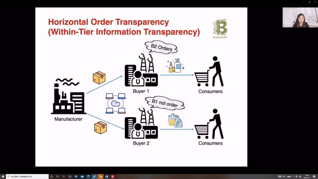 为解决这些问题,刘靓晨博士进一步讲述了两种不同维度的信息透明处理方式,第一种为垂直成本信息透明,该模式下的生产商采购成本对买家公开,使生产商能够依据采购策略执行动态定价;第二种为横向订单信息透明,该模式下所有买家的订购状态为公开信息,因此任一买家都可以基于其他买家的订购状态进行订购决策。通过构建博弈模型,获取供应链中各个利益相关方的均衡决策与收益,刘靓晨博士指出,区块链技术的引入是否有益于供应链与生产商的产能大小相关,且只有当产能足够大时,区块链技术对于所有利益相关方都是有益的;与之相对,当产能较小时,横向订单信息的透明度需要得到控制。