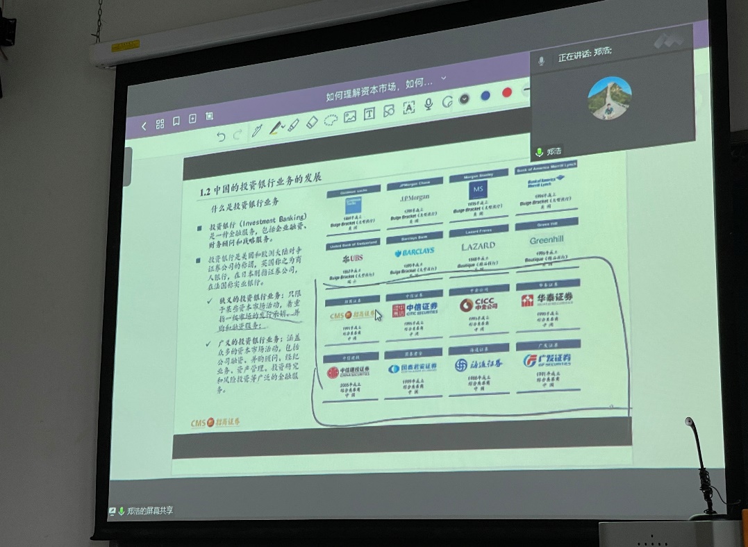 在提问环节,线上线下的多位同学积极提问交流,有同学提到希望了解走入投行需要具备哪些专业技能。对此,郑浩贴心给出了同学们进入投行的准备建议,包括对专业知识学习方向的推荐,对行业内认可度较高的专业证书的介绍,对目前投行工作招聘的具体要求。最后,郑浩表示投行很多工作岗位都需要数据分析相关的人才,希望同学们能充分发挥自己的专业优势,结合自身兴趣,做好职业规划。