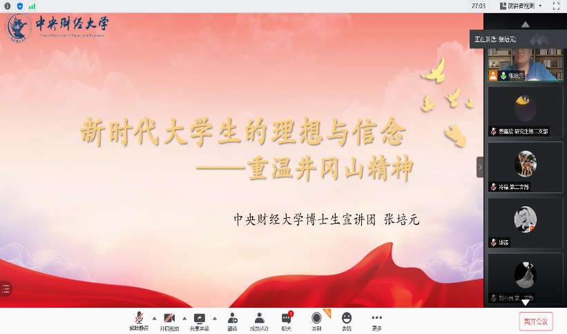 首先,博士生党支部书记张培元以“新时代大学生的理想与信念——重温井冈山精神”为主题,从五个方面介绍了井冈山精神的内涵,回顾井冈山的历史,他强调了坚定信念、艰苦奋斗,是井冈山精神的灵魂;实事求是、敢闯新路,是井冈山精神的核心;依靠群众、勇于胜利,是井冈山精神的基石。