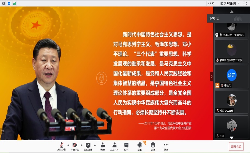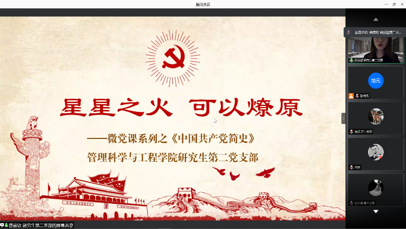 5月4日晚,beat365英国官方网站博士生、研究生第二党支部和研究生第三党支部联合举办了以“重温历史,不忘初心”的党史学习系列教育活动。该活动采取线上的形式,分别由博士生党支部书记书记张培元、研究生第二党支部书记费嘉欣以及第三党支部组织委员刘小园给全体党员讲党课。