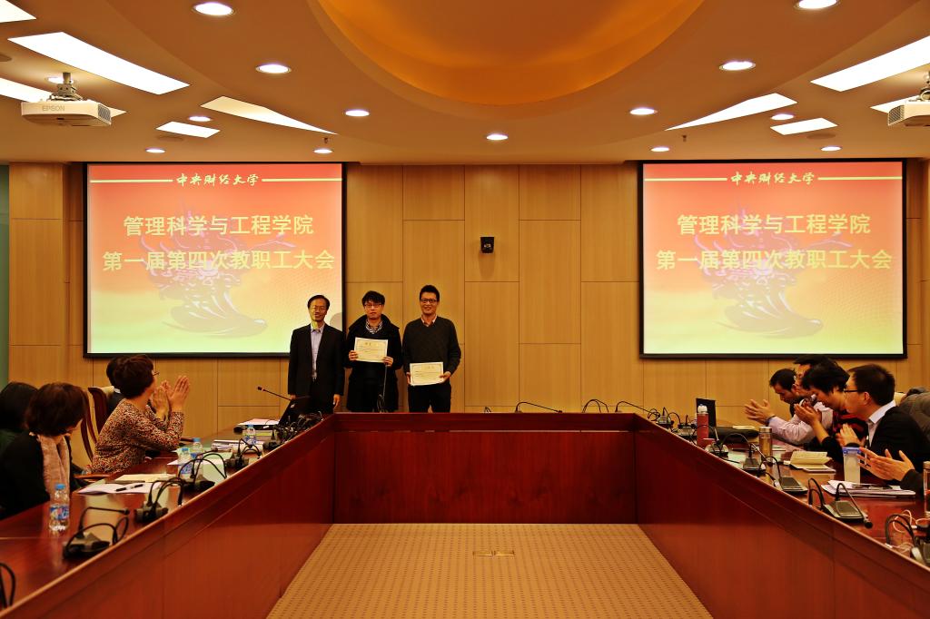副院长刘志东宣读了beat365英国官方网站2014年度“优秀科研奖”表彰文件,希望全院教职工以优秀为目标、以典范为动力,争取更大的科研成果。李文斌院长为“优秀科研奖“获得者李国平、井帅、王昊颁发荣誉证书。