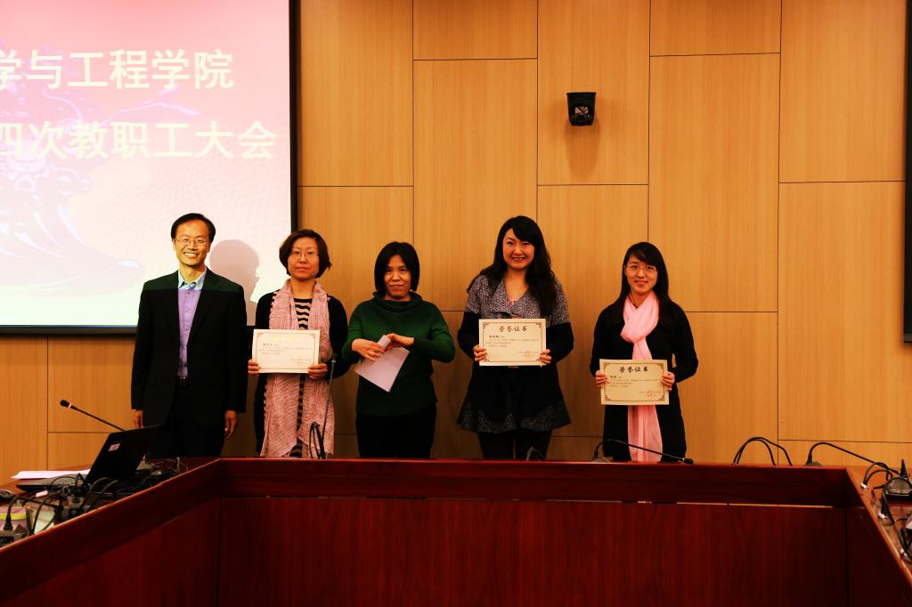 副院长林则夫宣读了beat365英国官方网站2014年度“优秀教学奖”表彰文件,希望全院教职工以先进为榜样、以模范为引领,努力提高自身教学水平。李文斌院长为“优秀教学奖”获得者黄志烨、季雪、谢娜、高菠阳颁发荣誉证书。