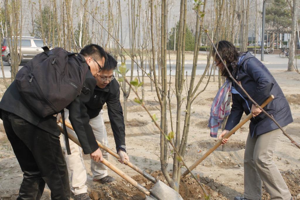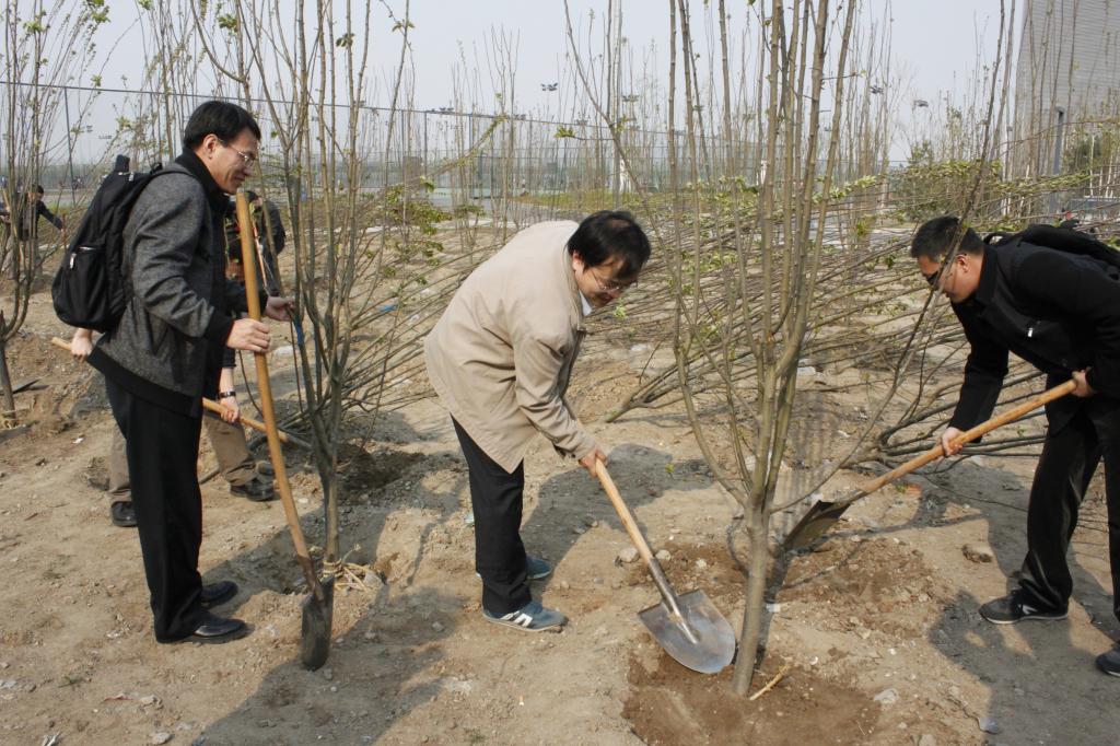 4月8日下午,beat365英国官方网站分工会组织开展了以“为校园增新添绿,作环境保护先锋”为主题的义务种树活动。副校长王瑶琪、beat365英国官方网站院长李文斌、党总支书记贺小海、分工会主席贾传亮等学院领导和40多位教职员工,在沙河校区东区体育场外南端的空地上,一起参加了本次种树活动。