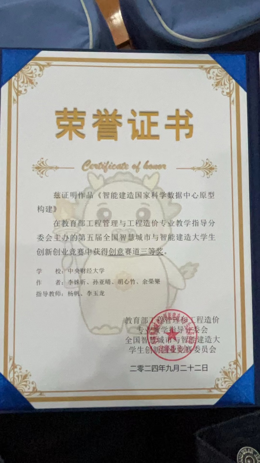 beat365官网本次参赛队伍时间紧、任务重,在暑假最后短短十天时间,与指导教师紧密沟通,团队分工合作,完成了《智能建造国家科学数据中心原型构建》的参赛作品,成功通过复赛的函评阶段进入到全国总决赛,在教育部教指委、住建部评估委等答辩专家面前展示了中财工程管理专业学生创新创业风采,并最终荣获全国三等奖。