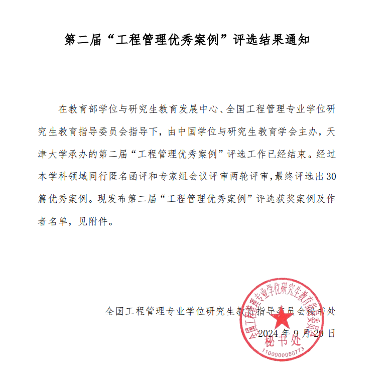中国专业学位案例中心(China Professional-degree Case Center,简称案例中心/CPCC)是由国务院学位委员会办公室和教育部指导,教育部学位与研究生教育发展中心牵头,财政部设立专项经费支持建设的案例教学服务平台。自2012年成立以来,案例中心坚持示范引领、共建共享、公益开放的发展理念,邀请各相关专业学位研究生教指委共同参与,探索并积累了案例建设的有益经验,我国目前体量最大、专业涉及范围最广的国家级案例中心。截至2023年3月,案例服务平台共开通工程管理、法律、教育、公共管理、会计等多个专业学位案例库,累计收录5095篇案例,服务517家培养单位,案例总浏览量超500万次。其中“工程管理优秀案例”评选始于2023年,每年评选一次,是全国工程管理专业学位研究生教育指导委员会组织评选的中国管理案例领域最高奖项。本届“工程管理优秀案例”评选,众多知名院校投稿参评,经过本学科领域同行匿名函评和专家组会议评审两轮评审,最终评选出30 篇优秀案例。beat365官网案例以评选分数第一名入选。