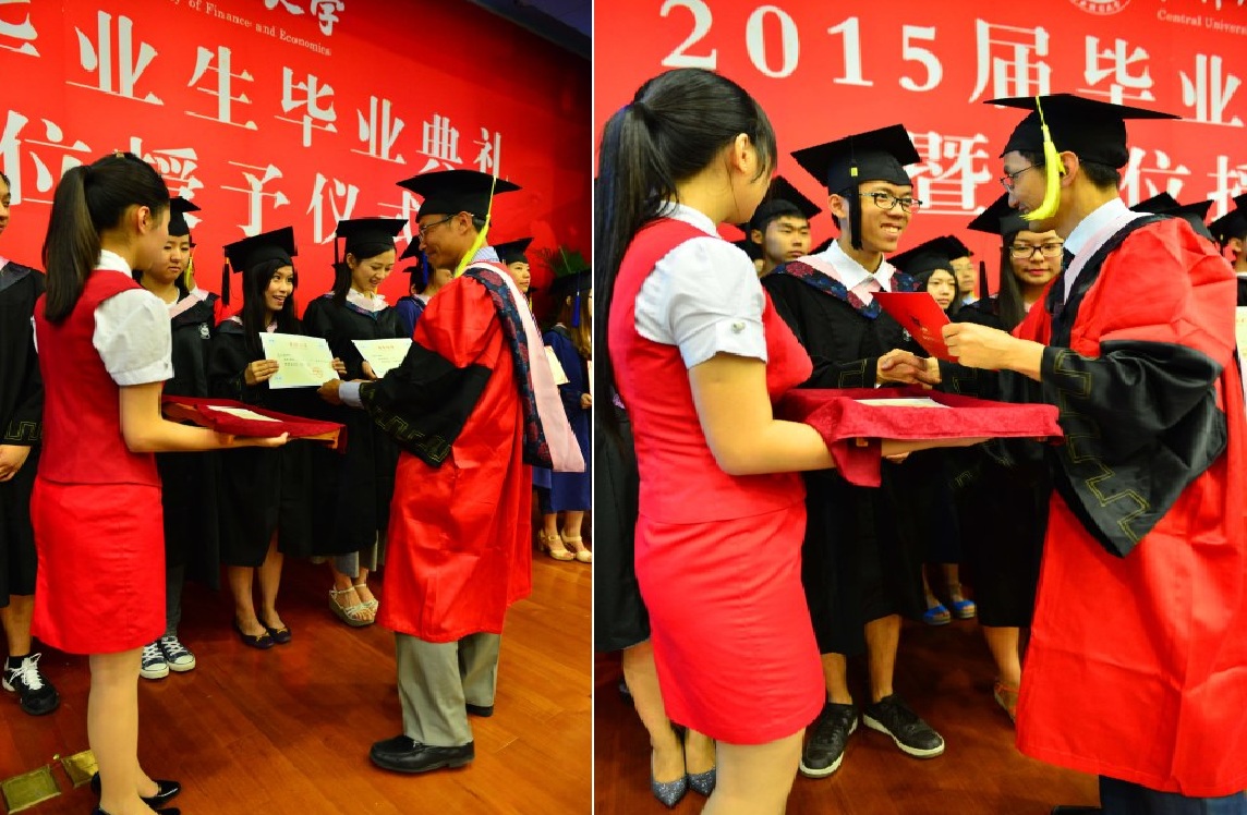 随后,党总支副书记贾传亮宣读了“关于2015届研究生毕业及授予学位的决定”及“关于2015届本科生毕业季授予学士学位的决定”。院长李文斌、党总支书记贺小海共同为2015届毕业生拨转流苏、颁发毕业证书和学位证书,并送上美好的祝福,表达殷切的期望。