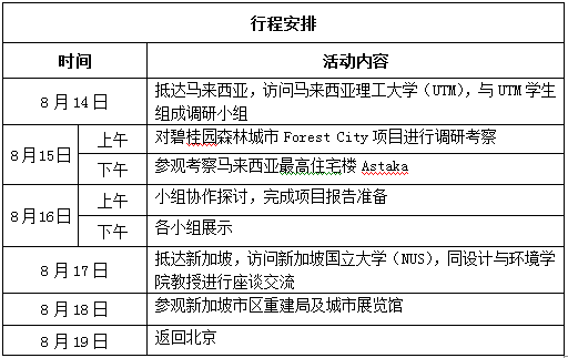 本次出访交流具体行程内容如下:第一天,由王昊老师带领十名本科生从北京乘机出发,于早八点抵达马来西亚理工大学(UTM),由马来西亚理工大学教职员带领参观大学校园环境,感受马来西亚大学校园氛围,随后与UTM的三名学生组成学生调研小组,进行自我介绍与初步了解,并做好项目实地考察准备工作;第二天团队前往当地基础设施建设项目进行考察调研,上午前往碧桂园在马来西亚的森林城市项目,同项目负责人深入访谈,了解项目相关情况,下午赴马来西亚新山市中心的Astaka马来西亚最高住宅楼进行参观调研;第三天,调研小组进行讨论,小组成员共同协作完成调研报告并做展示,由马来西亚教职员及王昊老师进行点评;第四天,由马来西亚新山前往新加坡国立大学(NUS)访问考察,与该校设计与环境学院师生围绕新加坡公用房问题进行座谈交流;第五天,前往参观新加坡市区重建局及城市展览馆,了解新加坡的城市规划及整体规划理念;第六天,由新加坡乘机返京,学习考察之旅结束。