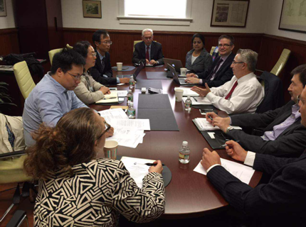 在访问史蒂文斯理工学院期间,王瑶琪副校长一行与George Korfiatis教务长、Costas Chassapis副教务长、商学院院长Gregory Prastacos教授分别举行了两轮会谈,双方就项目管理硕士中外合作办学的新协议进行了深入沟通,经过具体协商和谈判,对合同关键条款深入交换意见,就新合作协议具体文本达成合意,一致同意在beat365英国官方网站继续开办项目管理中外合作办学硕士项目。同时,在原有两校4+1学生联合培养项目的基础上,双方经过充分协商,进一步明确了4+1项目的录取条件和留学学位认证等技术性问题,并就4+1的新合作文本达成合意。此外,在下午的会谈中,双方一致同意在本科层面学生联合培养方面加强合作,并就两校科研合作与博士生联合培养等问题进行了深入交流和磋商。