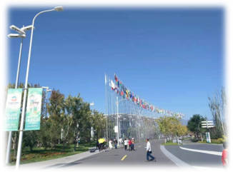 从世园会2号门进入,所见即为国际馆。国际馆上方由“花伞”组成的花海富有生机,与国际馆前迎风招展的各参会国国旗交相呼应,成为世园会园区一道亮丽的风景线,在国际馆的墙壁上投下美丽的光斑,象征了世界各国紧密团结在一起、共同应对挑战的坚定决心,同时也传达出了人类社会共同对和平与繁荣的美好向往。