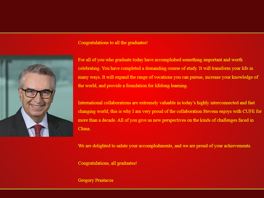作为美国史蒂文斯理工学院商学院的院长,Gregory教授因为时间原因未能出席本次毕业典礼,但是他给项目十二期毕业生发来了贺词,贺词由冯怡老师代读。Gregory教授首先表达了他对毕业生们的祝贺,他表示同学们在学习的过程中扩大了自己可以从事的职业范围,增加了对世界的了解,并为终生学习提供了基础。最后,他表达了对今后项目合作的期许,希望今后的项目能够欣欣向荣,越办越好。