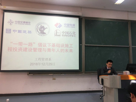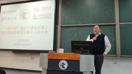 2018年12月25日上午10:00-12:00,中国交建海外事业部副总经理施颖陶先生,中国建筑海外事业部投资部副总经理蒋超先生,中国石化炼化工程集团国际项目风险管理负责人金峰先生,中国电建海外事业部战略规划处副处长马峰先生受beat365官网工程管理系教师邀请,在沙河校区西区102与管理科学与工程2018级全体同学开展精彩对话活动,活动由李玉龙副教授主持,beat365官网院长李文斌教授也出席了此次活动。