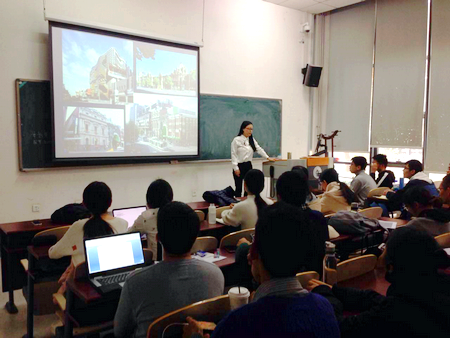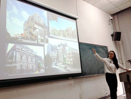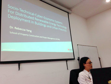 杨静博士首先对墨尔本皇家理工大学房地产,建筑和项目管理系以及她在墨尔本皇家理工大学的研究团队的成员和研究方向进行了介绍,然后选取了目前团队主要的研究项目:Socio-Technical-Cyber-Economic Systems For Distributed Renewable Energy Technology Deployment in Buildings and Urban Precincts 与大家进行了交流。分析了几种不同形式的光伏板放置方式和利用光伏材料作为建筑材料在城市中分布式发电的经济效益以及影响光伏发电经济效益的因素,展示了他们的模拟成果,介绍了他们的研究方法和技术,引起了大家的广泛讨论。在项目介绍完毕后,研究生们纷纷向杨静博士请教了各自感兴趣的问题,老师们也结合自己的研究提出了一些新的见解,在研究内容和研究方法上进行了深入的探讨。另外,杨静博士还对她的学生的研究项目进行了简单的介绍,为在座的研究生们提供了更多的研究思路。