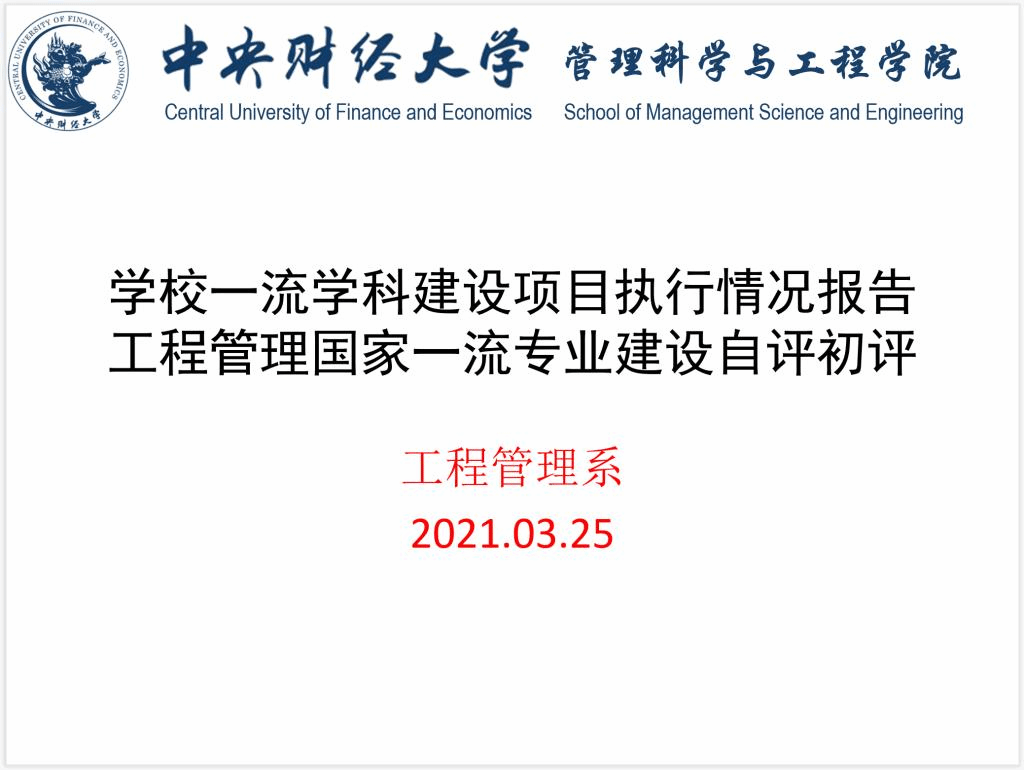 2021年3月25日,工程管理系召开了工程管理专业国家一流专业建设方案论证会。工程管理系主任李玉龙教授代表全系师生,对标教育部工程管理专业教指委颁布的《专业规范》和住建部工程管理专业评估委员会的《专业评估(认证)文件》的各项要求逐一排查,总结建设成果与不足,从师资力量、课程(知识)体系、实践体系、创新训练、课程学分设置、教学条件等方面全面向与会的学院党政领导报告。学院党委姜涛书记、刘志东院长总结发言指出学院今后将紧紧围绕“一流专业申报材料中关于人才培养目标的定位”,夯实既有建设成果,加速落实申报材料中关于专业建设的各项举措,履行好中财大对国家、社会、主管部门、教指委和师生家长的承诺。院领导表示学院今后将大力支持工程管理专业完成一流专业建设点的各项建设工作,并要求工程管理系全体师生鼓足干劲,“对标对表”,狠抓落实。