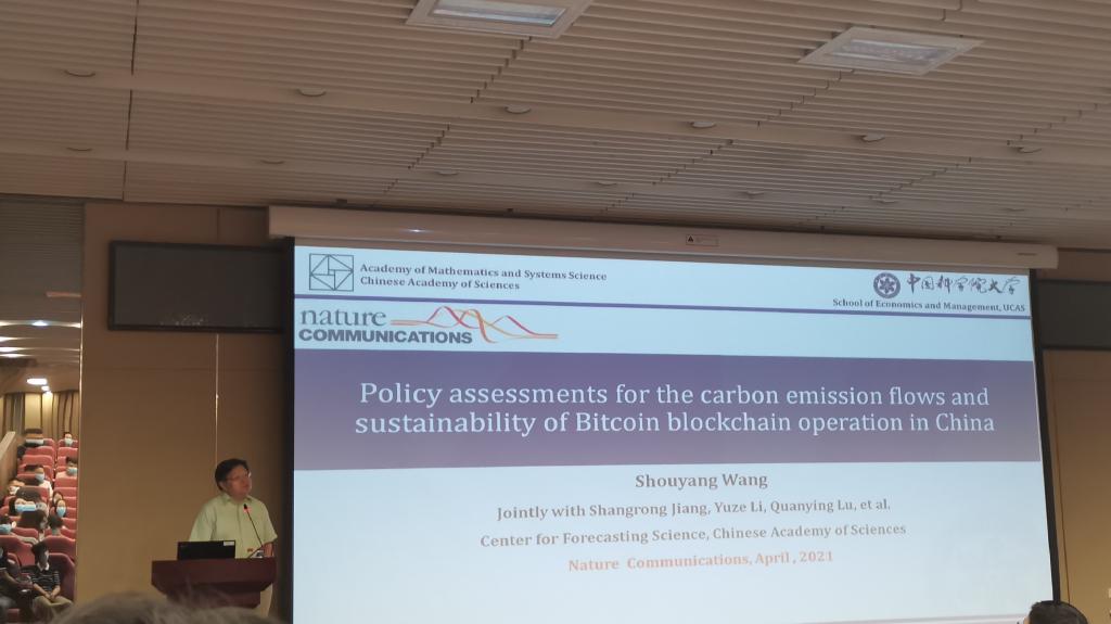 汪寿阳教授先就其团队发表于Nature子刊《Nature Communications》上的一篇论文《Policy assessments for the carbon emission flows and sustainability of Bitcoin blockchain operation in China》展开演讲,阐述了比特币的“挖矿”行为对全球碳排放的影响,提供了一些政策监管建议。这些研究工作引起了国内外学界的极大兴趣,也引发了全世界主要媒体的广泛关注。CNN、BBC、《时代周刊》、《新闻周刊》、《商业周刊》、《福布斯》、《经济学人》、《纽约时报》、《华盛顿邮报》、《金融时报》、《华尔街日报》等媒体几乎无一例外进行了报道。论文也引起中国国家领导人的高度重视和相关部门的积极行动。本次讲座就相关问题展开了分析与讨论。