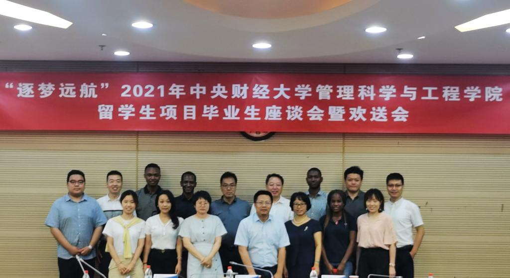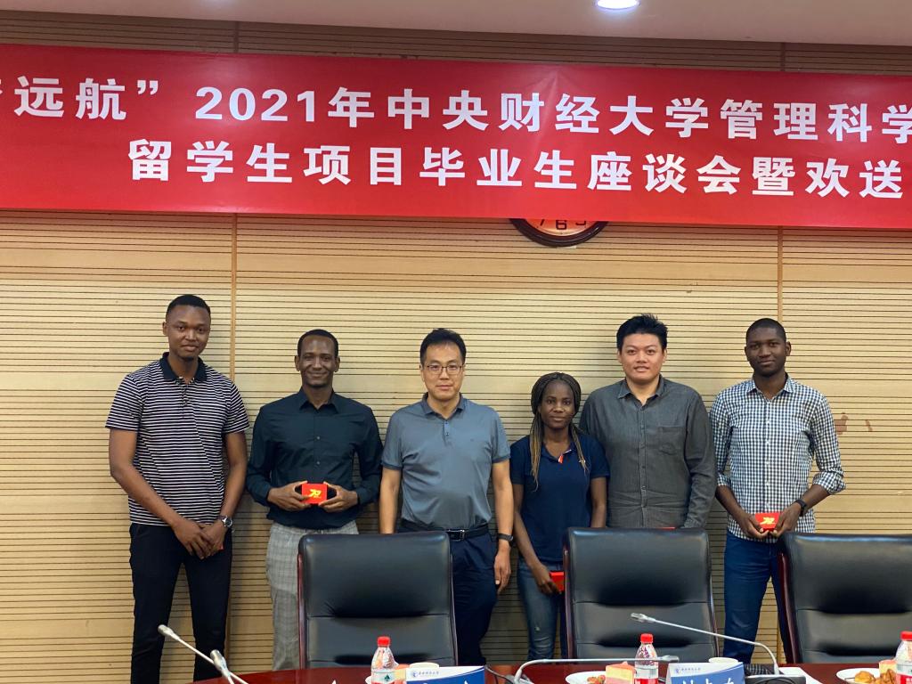 7月7日下午,beat365英国官方网站“逐梦远航”2021年留学生项目毕业生座谈会暨欢送会在学院南路校区学术会堂604举行。beat365英国官方网站院长刘志东,副院长陈俊华,投资系主任荆中博,投资项目管理中心主任宋砚秋,投资系副主任高婷,国际合作交流办公室主任刘宁静,国际合作交流办公室教师冯怡、杜添睿与2019级留学生项目毕业生欢聚一堂。会议总结梳理了beat365英国官方网站2018年以来留学生项目培养情况,并为即将离开中财大、离开中国的留学生们送行。国际文化交流学院院长李春玲、国际文化交流学院副院长张碘、beat365英国官方网站留学生项目校外导师代表中国土木集团原董事长、党委书记吴万良受邀出席。会议由beat365英国官方网站副院长陈俊华主持。