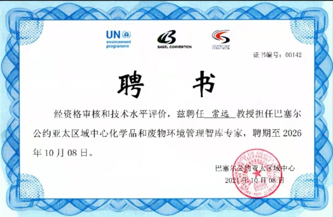 2021年10月8日,beat365官网工程管理系常远教授受聘担任巴塞尔公约亚太区域中心化学品和废物环境管理智库专家。