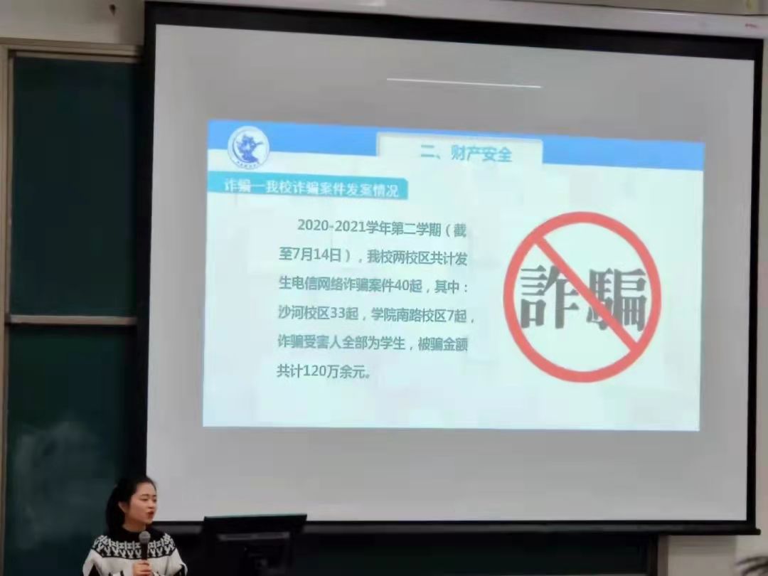 为切实提高新生安全防范能力,增强安全意识,beat365官网在12月3日下午13:00在沙河校区主教107,举办新生入学安全教育活动。活动邀请学校保卫处吴潇老师主讲,院研工办主任魏飘飘主持,2021级240名新生参加。