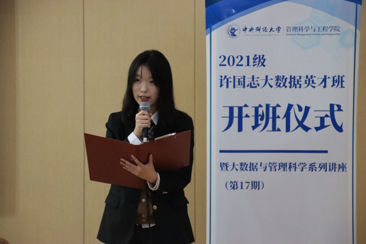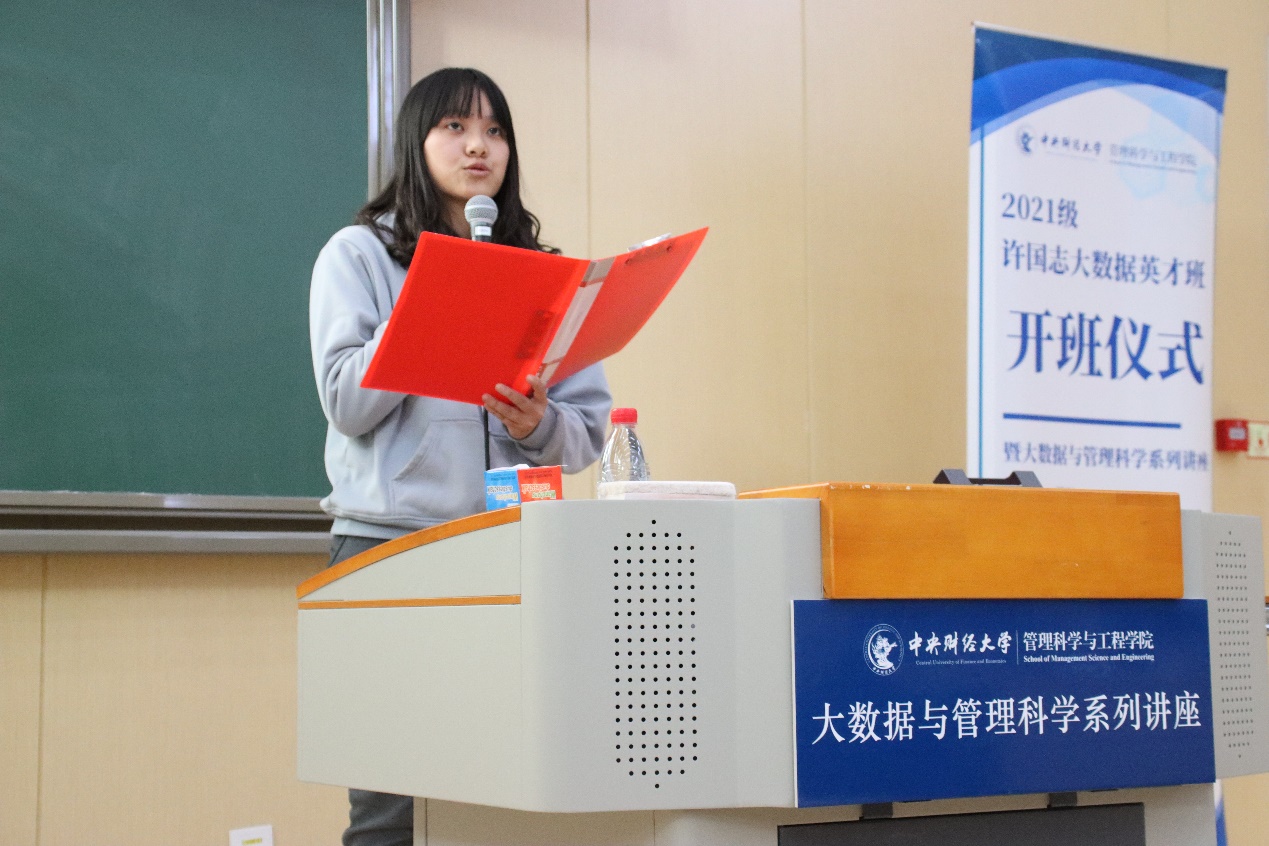 2021级英才班学生王韵涵作为新生代表发言。她代表第二届英才班全体同学对许国志先生献身学科建设、上下求索的精神致以崇高的敬意,表达了入选英才班的自豪和激动。她表示,作为“许国志大数据英才班”的学生,将在今后的学习生活中继承并发扬许国志先生的爱国与科学精神,秉承“忠诚团结、求实创新”的校训,勇于屹立时代发展之潮头,把握机遇,实现自我价值,不辜负beat365英国官方网站与中科院系统所的栽培,用实际行动担当起时代重任