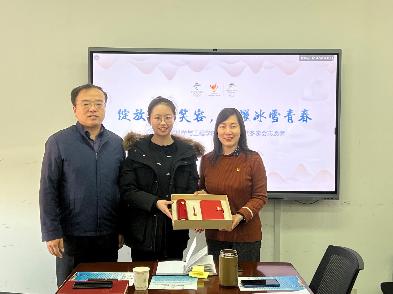 姜涛、贾传亮代表学院为志愿者们赠送慰问礼包,姚逍代表组织部党支部为志愿者们赠书。