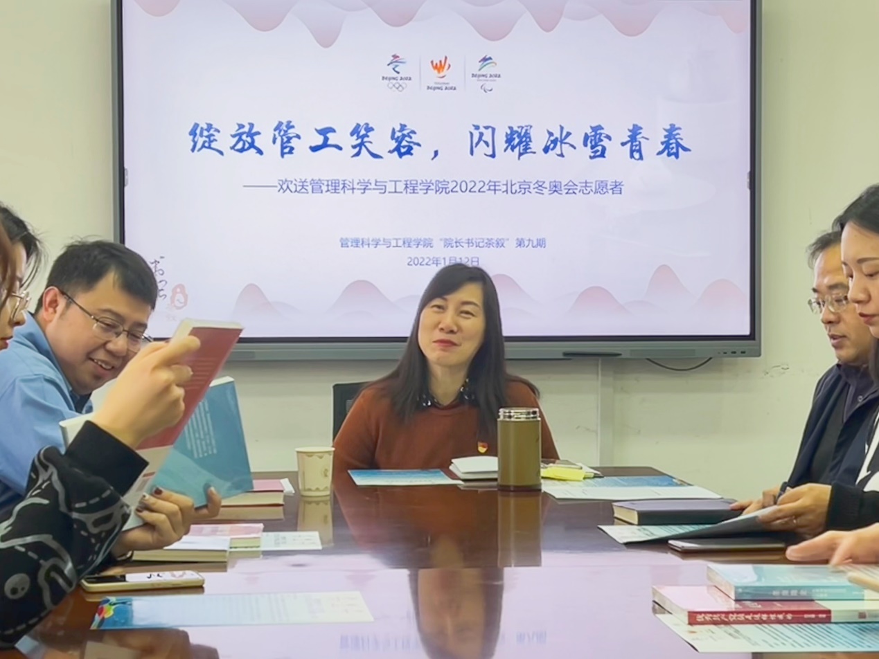 1月12日中午,院长书记茶叙第九期在学院4号楼320会议室举行,本期主题是“绽放管工笑容,闪耀冰雪青春——欢送beat365英国官方网站2022年北京冬奥会志愿者”。学院党委书记姜涛,学院党委副书记贾传亮,校党委组织部副部长、学院共建联系党支部学校机关党委组织部党支部代表姚逍,与beat365官网即将启程奔赴冬奥服务保障工作一线的16位志愿者品茶叙谈,学院团委书记高舒娅和部分团支部团员骨干代表参加。