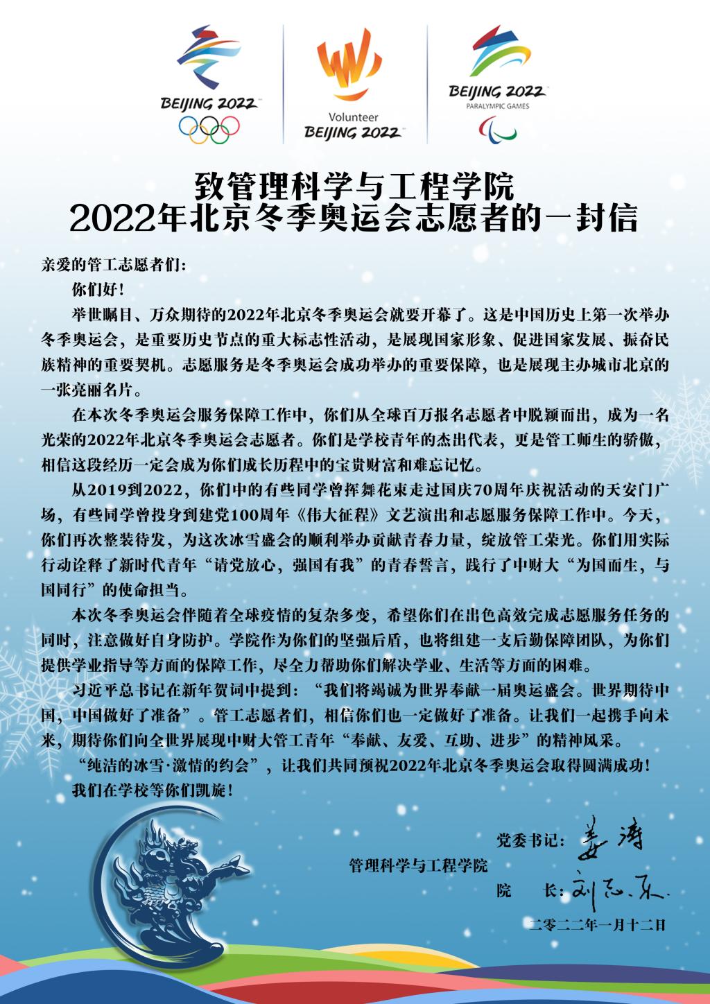 “纯洁的冰雪,激情的约会”,让我们一起携手向未来,共同预祝2022年北京冬奥会取得圆满成功!预祝管工志愿者胜利凯旋!