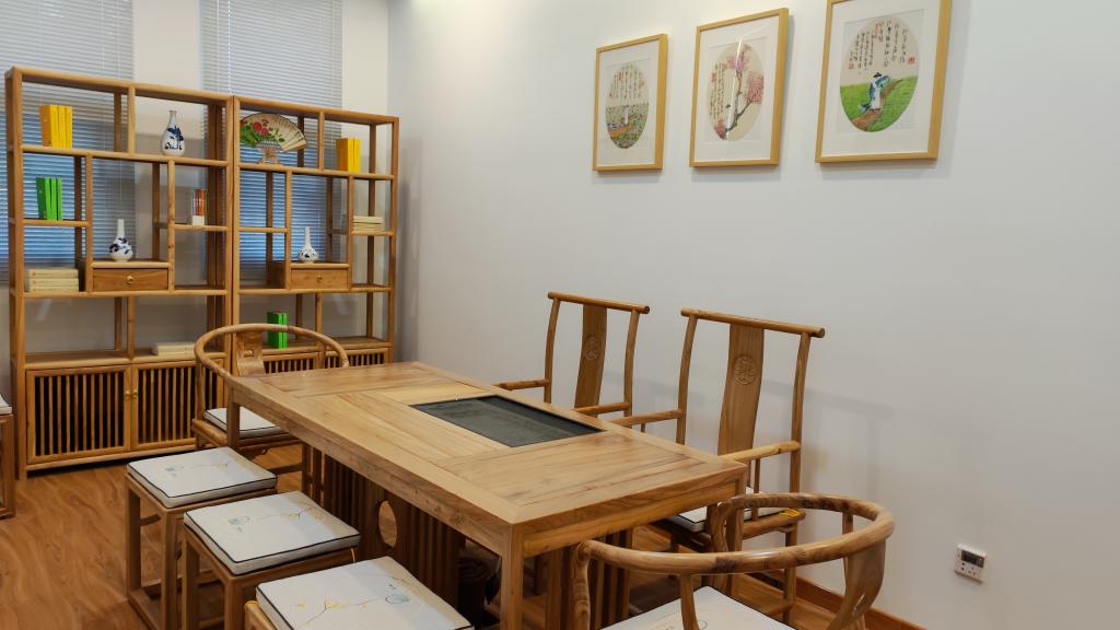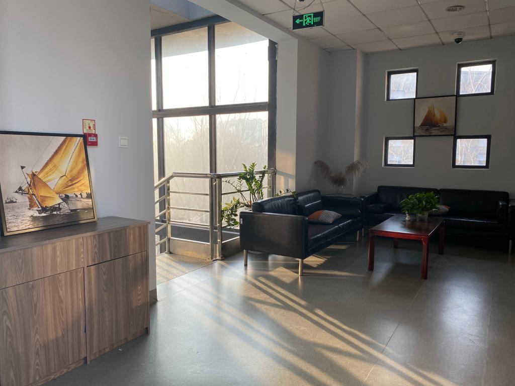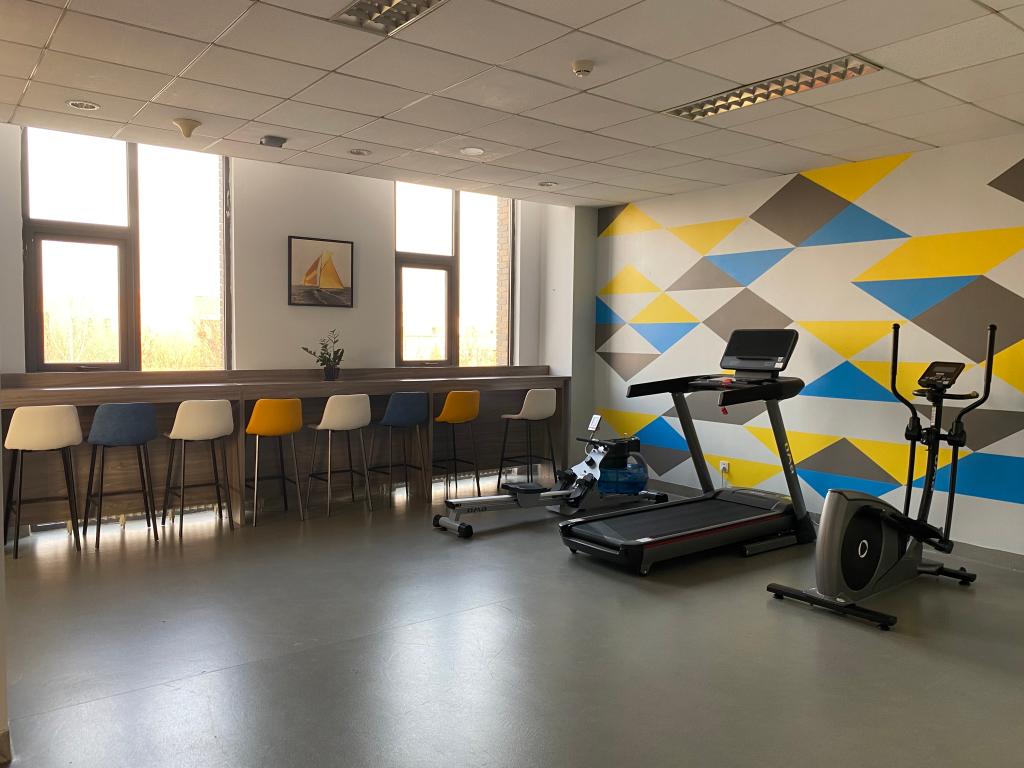学院办公区西段,有运动健身设施,有可学习、可闲坐、可休憩的吧台、沙发、茶几。