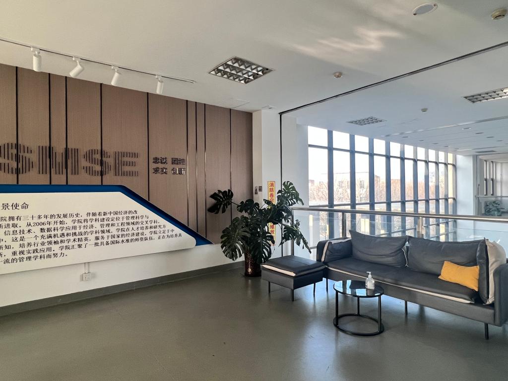 从学院4号楼中部台阶走上三层,迎面看到的是富有现代气息的学院目标愿景墙。