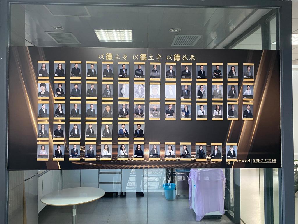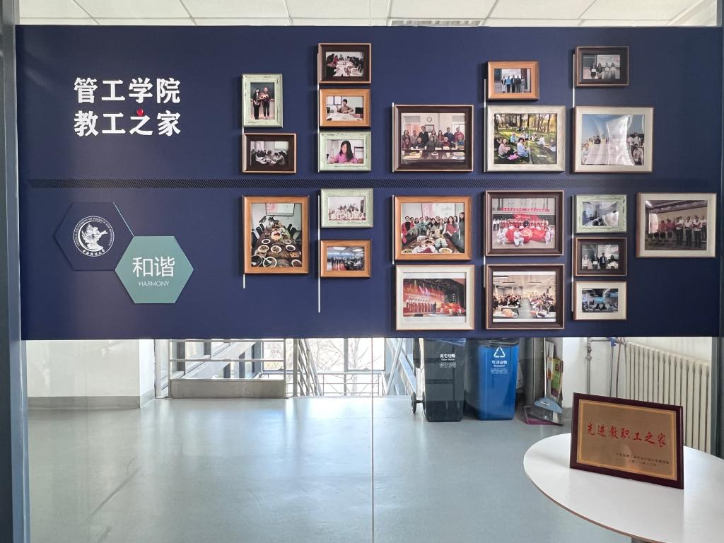 向东环绕,依次可以看到崭新的学院荣誉展示墙,温馨的教工之家,写有“以德立身、以德立学、以德施教”的教师照片墙,和学院接待室。