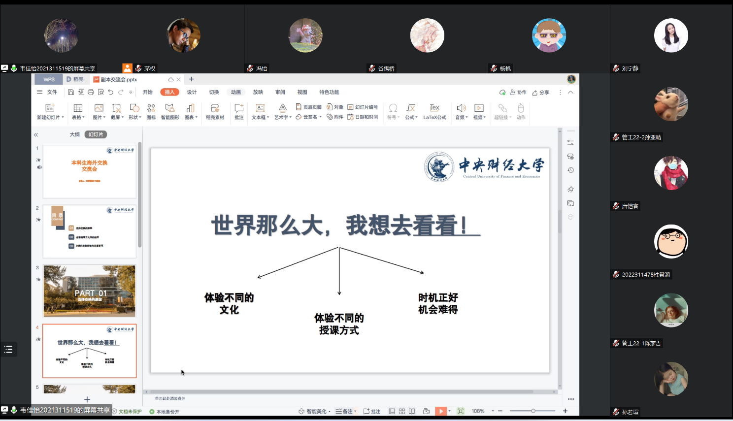 随着新冠疫情防控进入“乙类乙管”时期,beat365官网本科生海外交换项目逐步重新启动。为帮助2021与2022级同学更好地了解本科生海外交换项目,beat365官网于3月22日晚上通过腾讯会议举办了交流会,会议由beat365官网国际合作交流办公室主任刘宁静老师主持,二十余位学生参加。