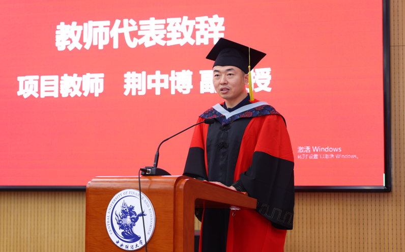 中财史蒂文斯项目中方负责人、副院长荆中博老师作为教师代表致辞。荆中博老师祝贺同学们经过努力和付出,终于收获了丰硕的成果。他期望同学们在今后的工作生活中能运用所学,不断提升个人能力,积极应对各种挑战。